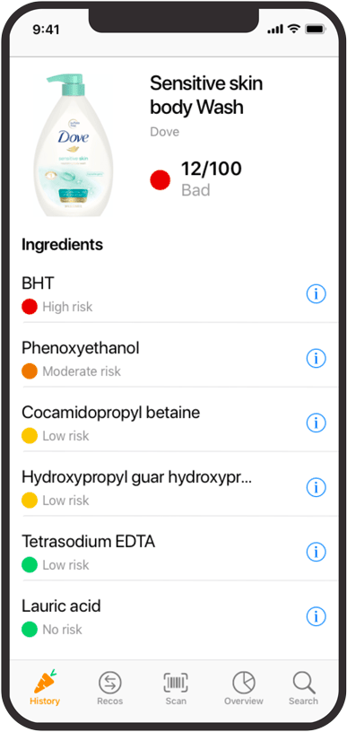 Yuka analyzes personal hygiene and cosmetic products. You get a detailed data sheet for each product to help you understand its score.