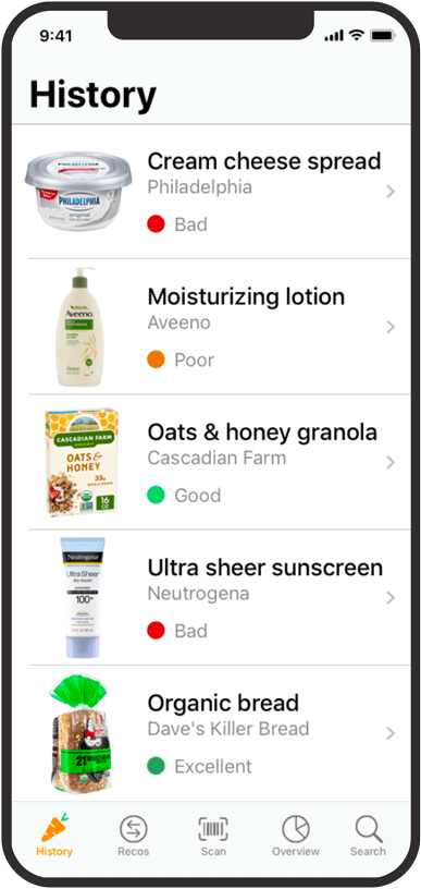 Yuka displays the products you have already scanned. An easy-to-understand color code lets you view the product’s impact on your health.