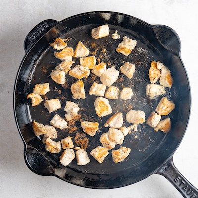 In a skillet, heat olive oil over medium heat. Generously season chicken pieces with salt and pepper. Add chicken to hot skillet and cook 4-5 minutes per side, until cooked through.