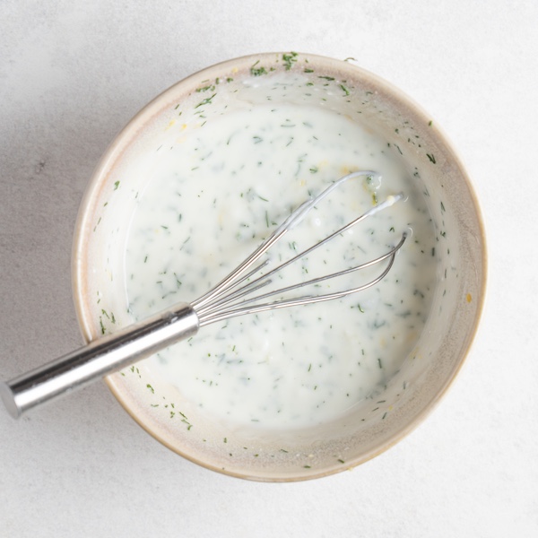 In a small bowl, combine yogurt, lemon juice, lemon zest, honey, garlic and most of the dill. Whisk until smooth, adding water 1 teaspoon at a time until pourable.