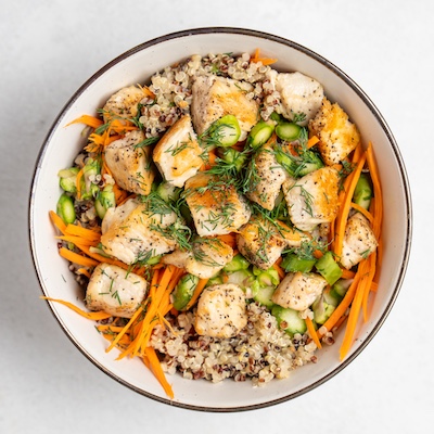 Divide quinoa between bowls. Top with shredded carrots, sliced asparagus, and chicken, then drizzle with vinaigrette and garnish with chopped dill.