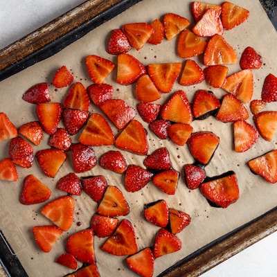 On prepared sheet pan, toss strawberries with balsamic vinegar and avocado oil. Spread into a single layer and roast 20 minutes. Allow to cool slightly.