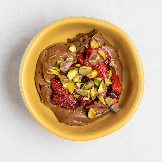 This silky chocolate pudding gets its creamy texture from avocado and natural sweetness from maple syrup. Finished with roasted strawberries and pistachios, it’s a vegan, dairy-free, and gluten-free dessert that feels indulgent while staying wholesome.