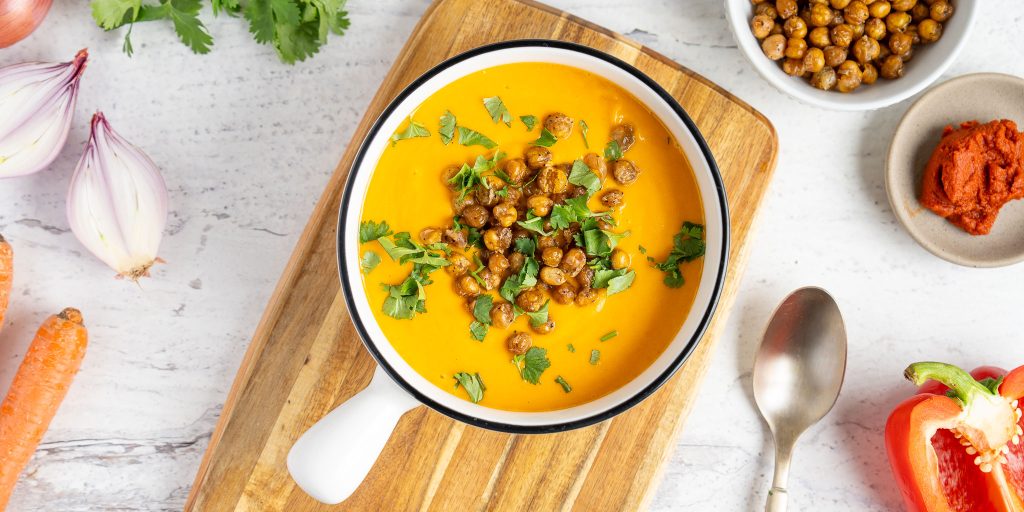 As the days grow shorter, this Curried Butternut Squash and Red Pepper Soup is the perfect way to embrace fall. It fills the kitchen with warm, vibrant aromas and a hint of spice. The hearty vegetables blend into a silky base that is enriched with coconut milk, and the curried chickpeas add a satisfying crunch. Enjoy this nourishing, plant-based recipe whenever you need a little warmth on a cool autumn day.