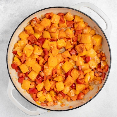 In a large pot, heat remaining 1 Tbsp olive oil over medium-high heat. Add bell pepper, shallot, and carrot. Saute 4-5 minutes. Add butternut squash and cook another 4-5 minutes to brown. Add garlic and cook 1 minute, until fragrant. Add curry paste and stir to combine. Cook 1 minute.