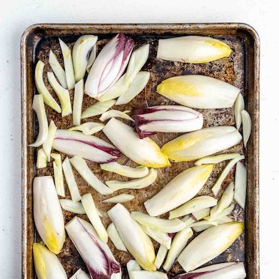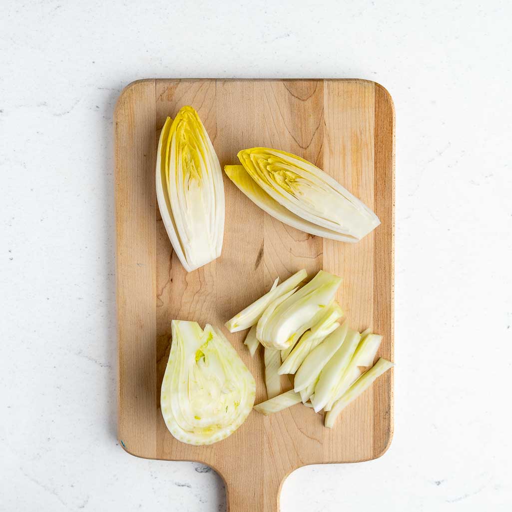 Preheat oven to 425°F. Trim ends from endive and slice in half lengthwise. Remove root and fronds from fennel bulb then slice bulb into 1/2 inch slices.