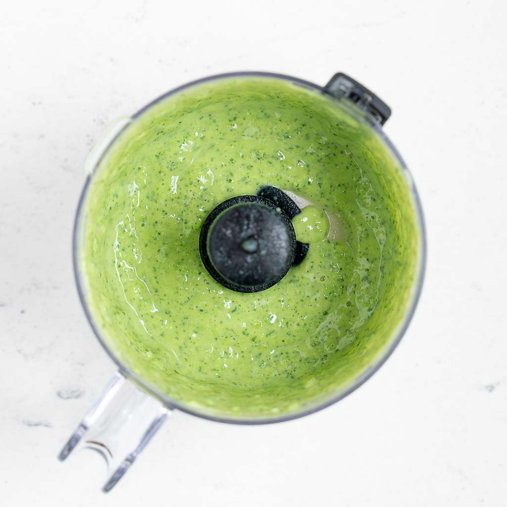 In a food processor or high speed blender, combine 1 tbsp water, peas, silken tofu, cilantro, mint, lemon juice, lemon zest, garlic cloves, and salt and pepper to taste. Process until smooth.