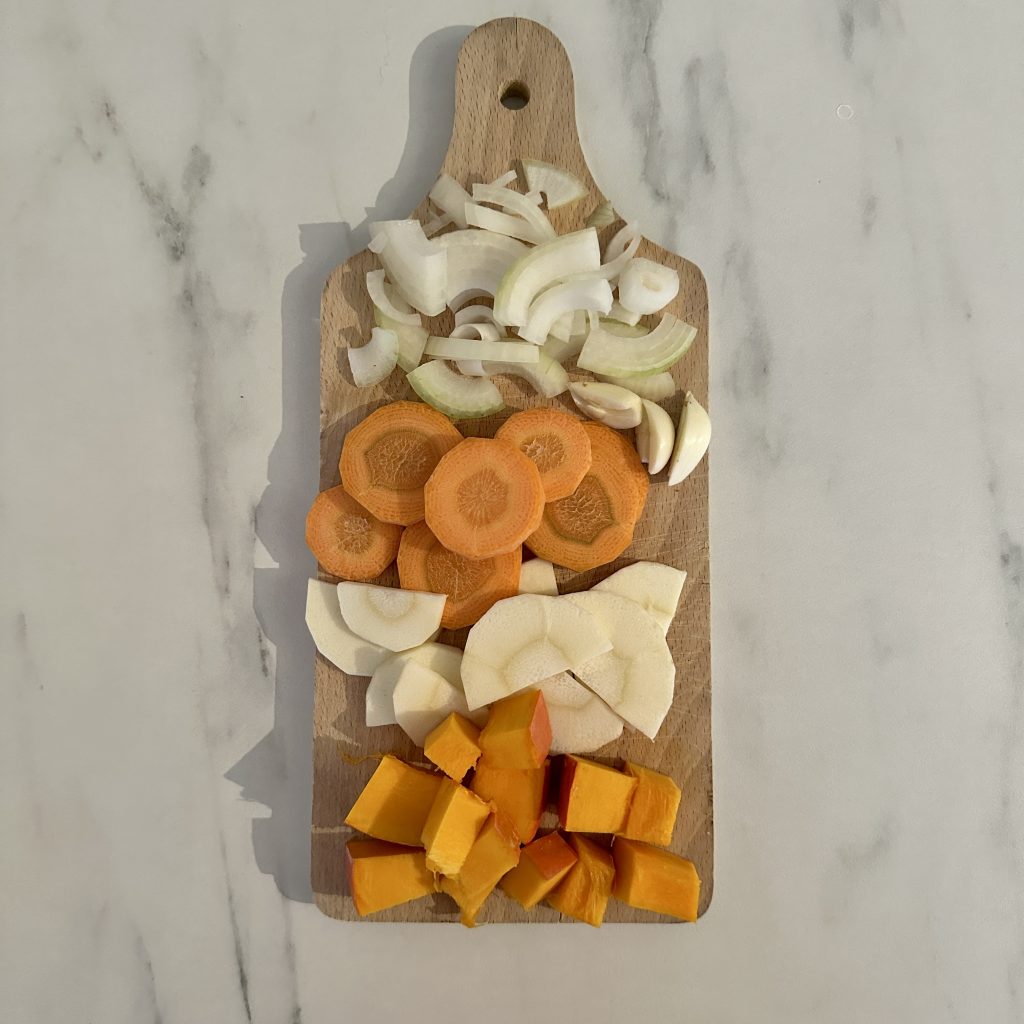 Peel the onion, garlic, carrots, and parsnip. Chop the onion and garlic finely, and slice the carrots and parsnip. Peel and seed the butternut squash, then cut into cubes.