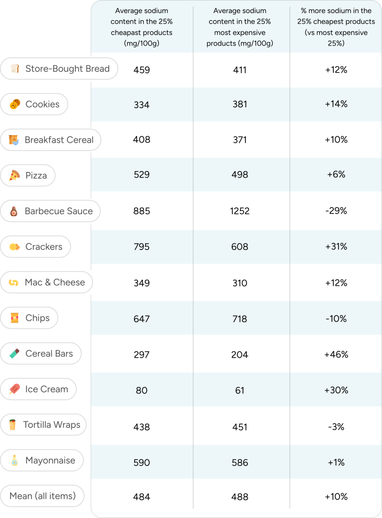 On average, the cheapest products contain 408 mg of sodium/100g, compared with 371 mg/100g in the most expensive ones. Consequently, the 25% lowest-sodium products are, on average, 59% more expensive than the 25% highest-sodium ones.