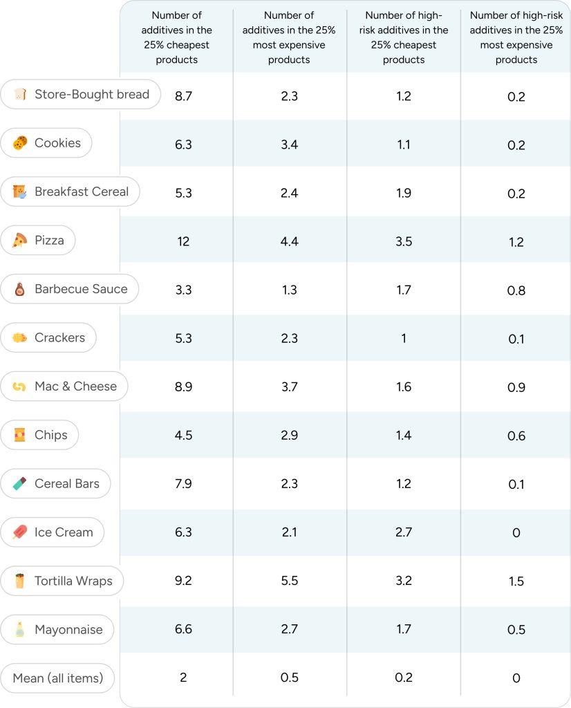 Overall, the results point to the same conclusion: avoiding additives—and especially high-risk additives— isn’t equally affordable. Products without high-risk additives are, on average, 63% more expensive than those with high-risk additives.