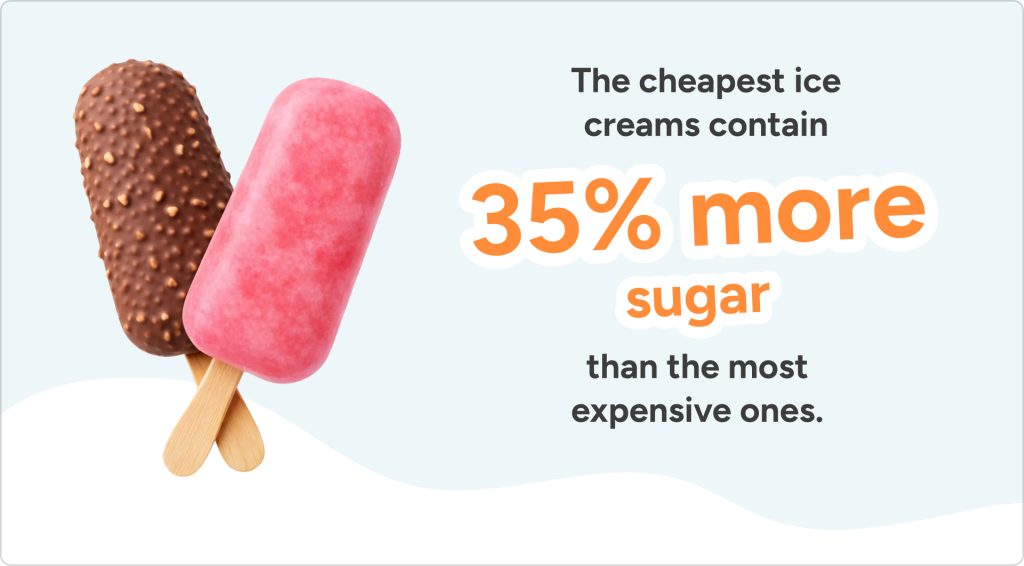 Here too, based on our analysis of 47 products from 28 different brands, price tracks sugar content: ice creams in the lowest-priced quartile contain, on average, 31% more sugar than those in the highest-priced quartile—21g of sugar per 100g, compared with 16g of sugar. Products in the lowest-sugar quartile are, on average, 47% more expensive than those in the highest-sugar quartile.