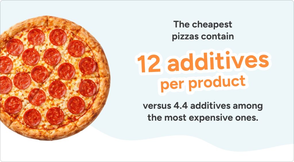 Across the 12 categories analyzed, the cheapest products contain, on average, 2.6 times more additives than the most expensive ones. Products in the lowest price quartile (25%) contain an average of 6.6 additives per item, whereas those in the highest price quartile (25%) contain an average of 2.7 additives.