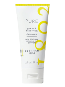 This hand cream features a fragrance-free formula made with goat milk and botanical extracts, designed for dry and sensitive skin. |