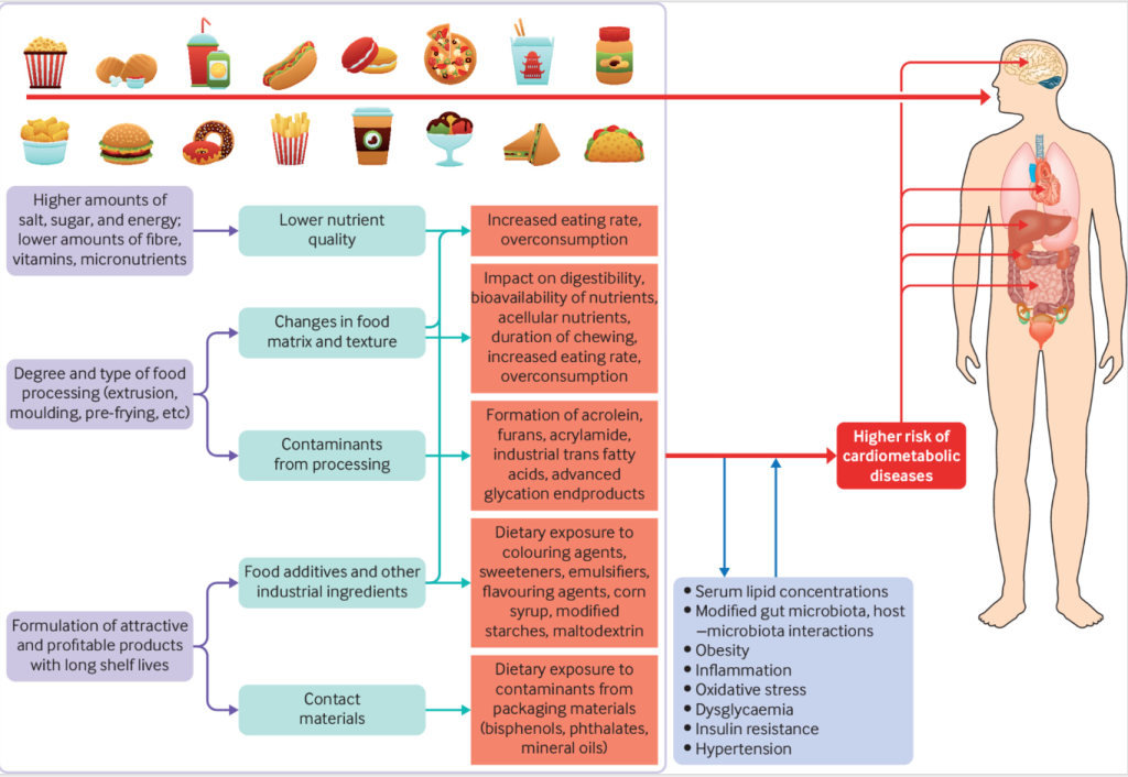 The following diagram summarizes the complex mechanisms behind ultra-processed foods, as described by leading researchers in the field. Despite the complexity, these experts argue that an incomplete understanding of these mechanisms should not be used as an excuse for inaction.