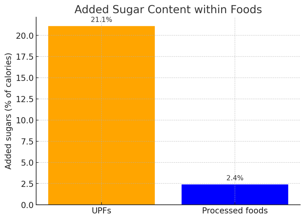 UPF contributes nearly 90% of all added sugars in US products. Numerous studies show a strong statistical link between UPF intake and total sugar intake: the more UPFs people eat, the more added sugar they consume.38 Data from the two most recent NHANES national surveys confirm that UPFs represent the largest source of dietary sugars in the American diet. On average, sugars account for 21% of total calories of UPFs compared to only 2.4% in processed foods. This is no coincidence: sugar is deliberately added —even in savory products— to achieve the so-called “bliss point” and stimulate brain reward circuits and reinforce cravings. The bliss point refers to the optimal combination of sugar, salt, and fat that makes food hyperpalatable and difficult to resist.39