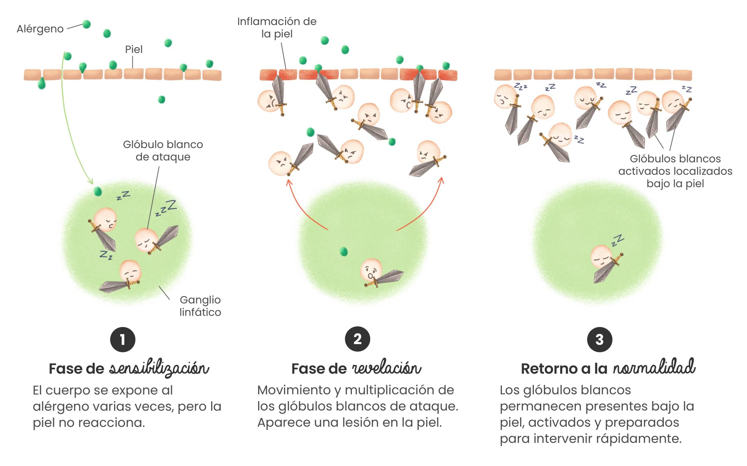- Para empezar, hay un periodo de exposición repetido a un alérgeno. No pasa nada, así que pensamos que todo va bien. Pero mientras tanto, nuestro sistema inmunitario ya considera a este elemento como un enemigo. Esta es la fase de concienciación.