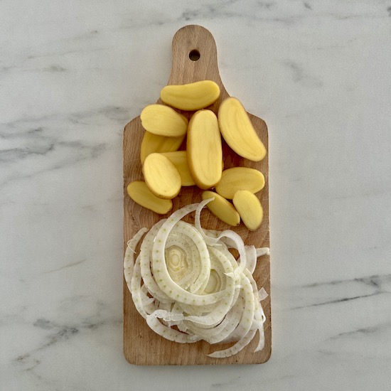 Préchauffez le four à 180°C. Lavez les pommes de terre sans les éplucher, puis coupez-les en deux ou en 4 (selon la taille) dans le sens de la longueur. Lavez le fenouil et taillez-le en tranches assez fines, à la mandoline ou au couteau.