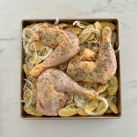 Disposez le poulet avec sa peau, les pommes de terre et le fenouil sur une grande plaque allant au four. Arrosez d’huile d’olive, salez, poivrez et ajoutez les herbes de Provence. Mélangez le tout, à l’aide d’une cuillère en bois ou à la main, pour que tous les ingrédients soient enrobés de façon homogène de sorte qu’ils ne sèchent pas lors de la cuisson.