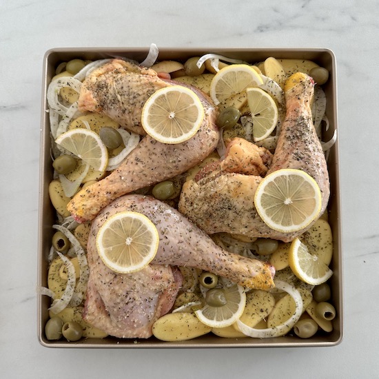Répartissez les olives vertes sur la plaque et déposez une fine rondelle de citron sur chaque cuisse de poulet ainsi que quelques rondelles sur les légumes.