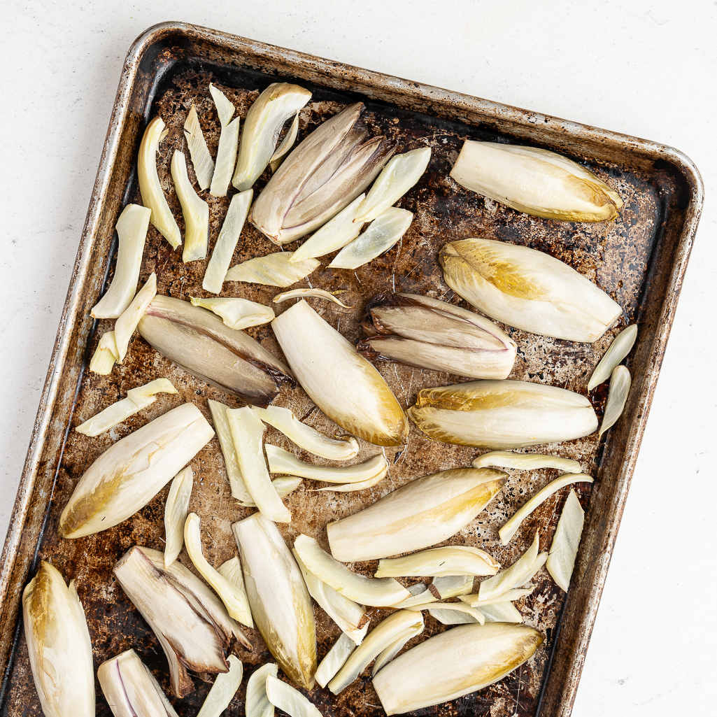 Salade d’endives & fenouil rôtis, sauce aux petits pois